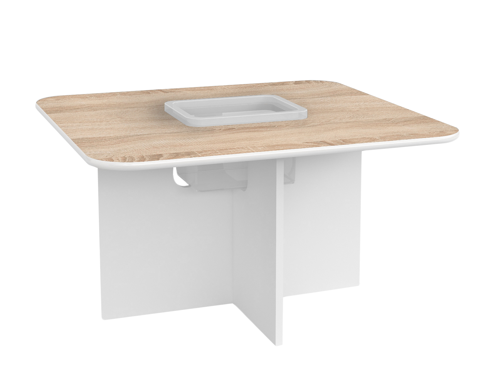 W zestawie znajdują się: stolik w kolorze biało-sonoma oraz plastikowy pojemnik.