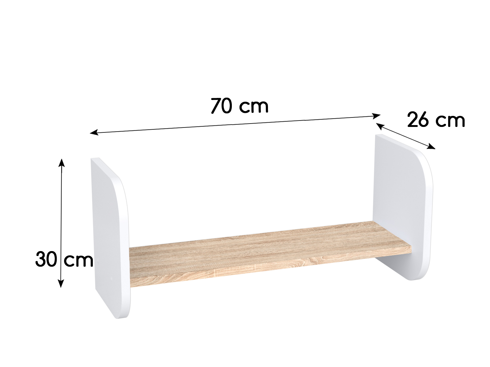 Półka wisząca o szerokości 70 cm to praktyczny dodatek do każdego wnętrza. Dzięki minimalistycznemu designowi i kolorowi biało-wenge doskonale wpasuje się w każdą aranżację, skutecznie wykorzystując wolną przestrzeń nad łóżkiem, biurkiem czy sofą.