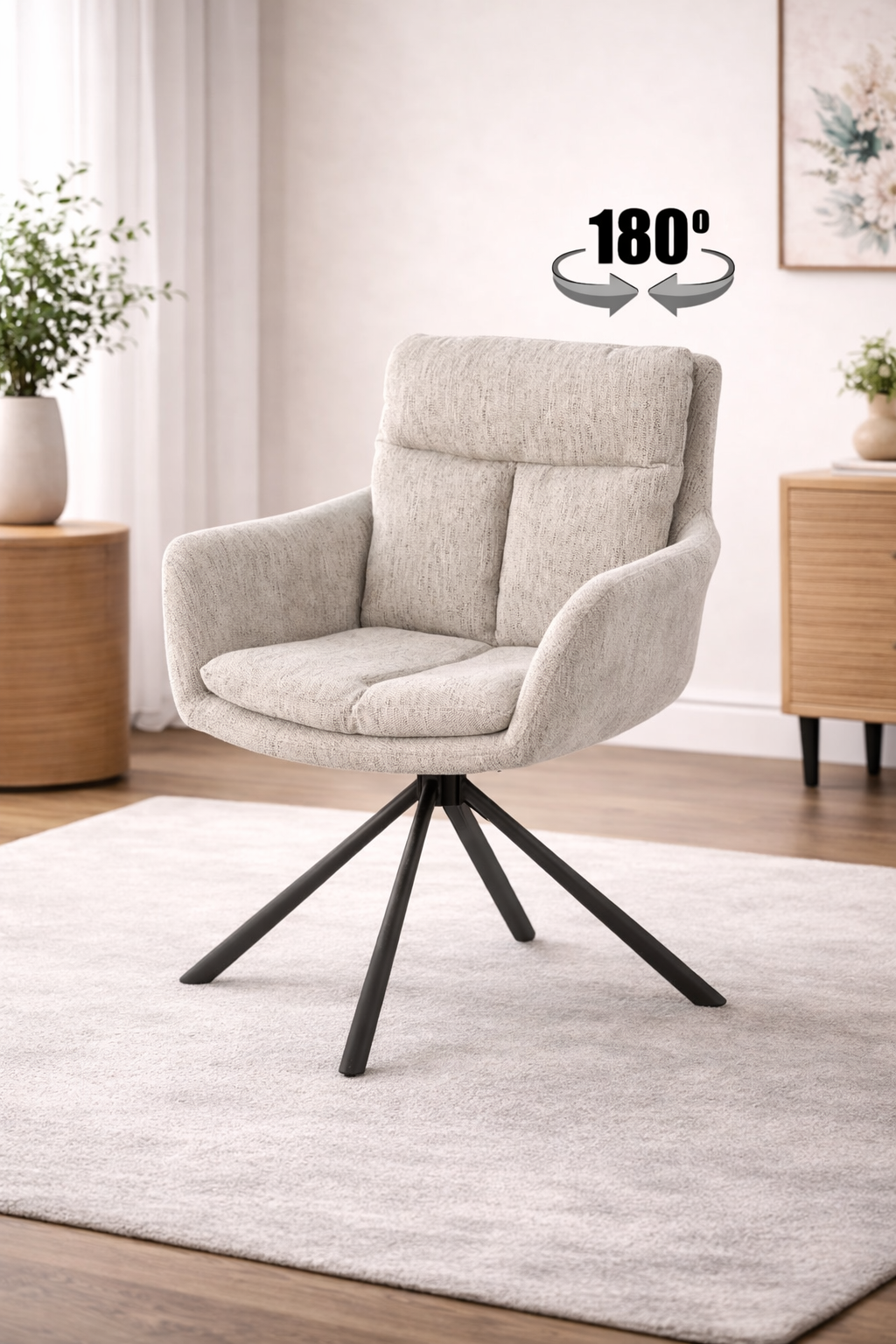 Miękko tapicerowane siedzisko oraz ergonomicznie wyprofilowane oparcie zapewniają komfort nawet podczas dłuższego użytkowania. Dzięki obrotowej funkcji siedziska, możesz łatwo zmieniać kierunek siedzenia bez konieczności przesuwania mebla — to rozwiązanie sprawdzi się szczególnie przy stole lub w pracy przy biurku.