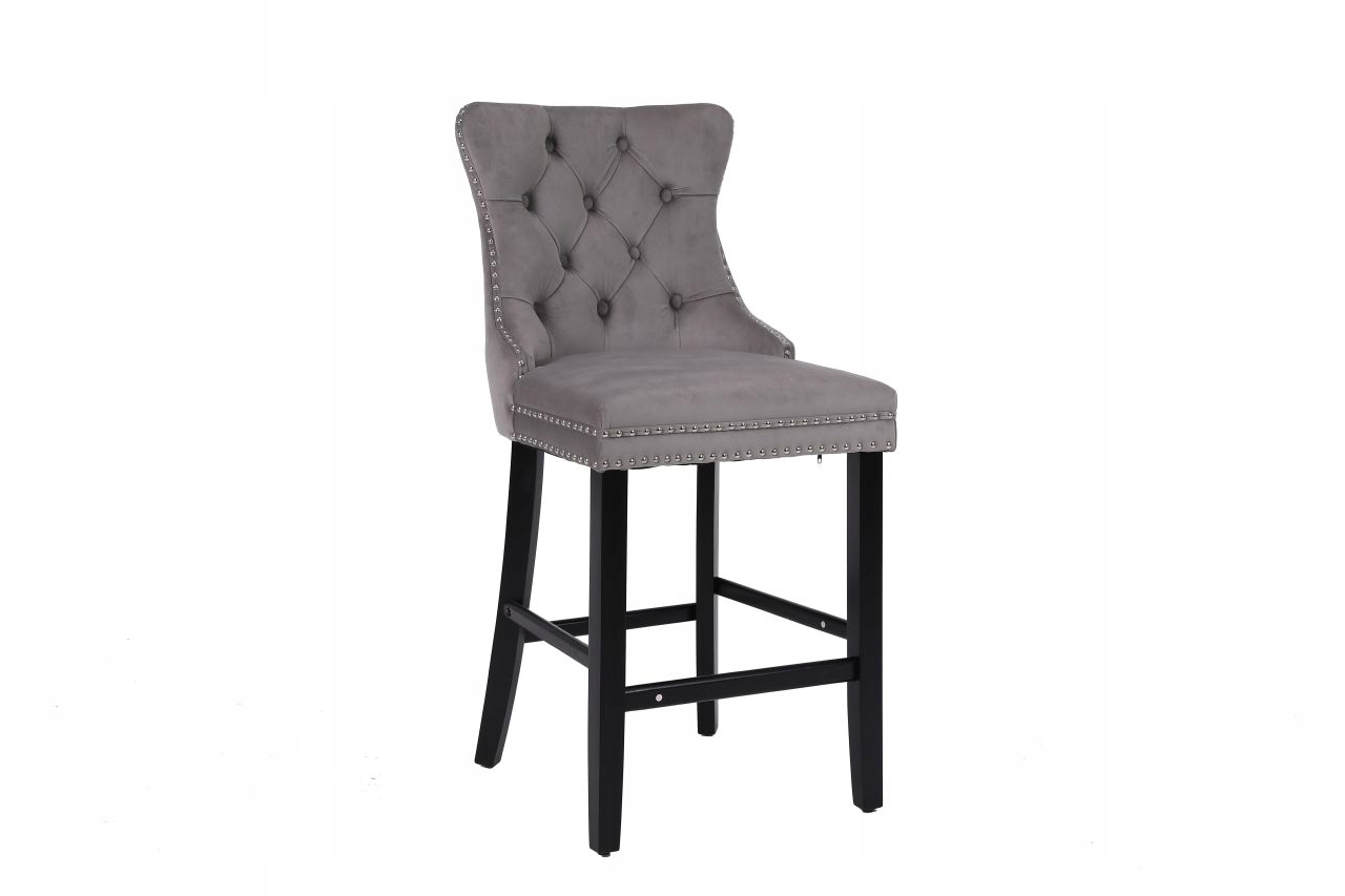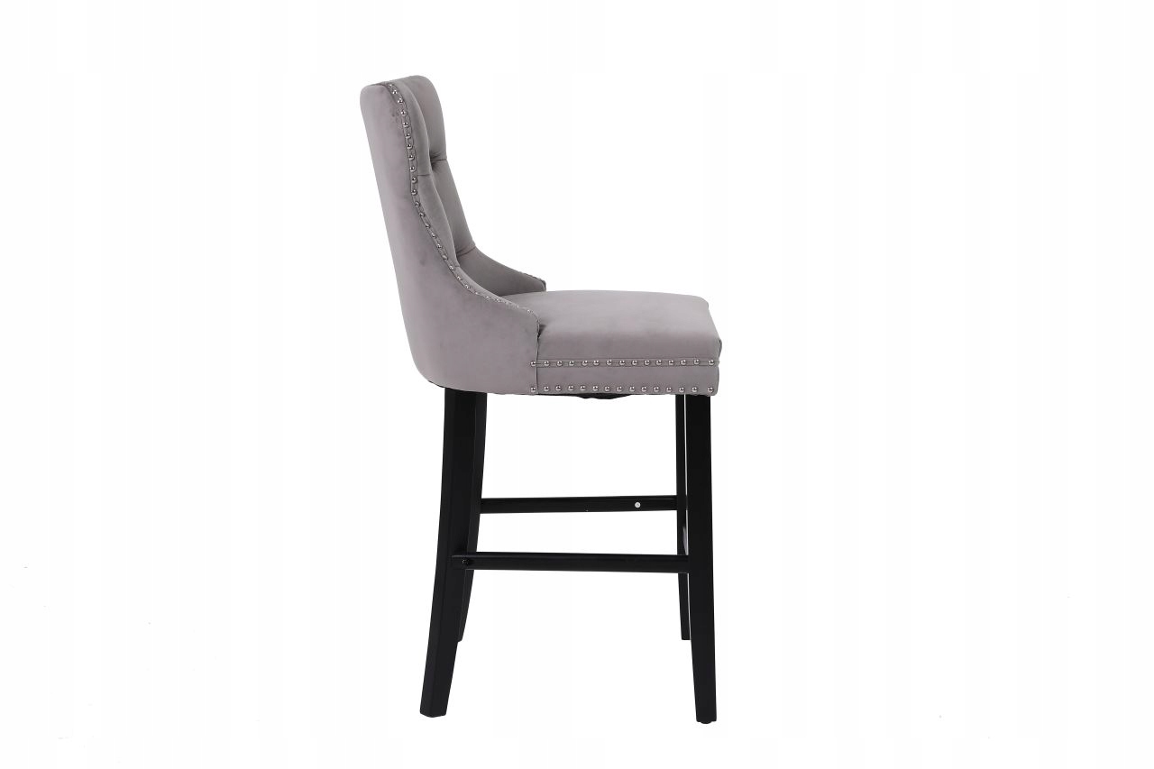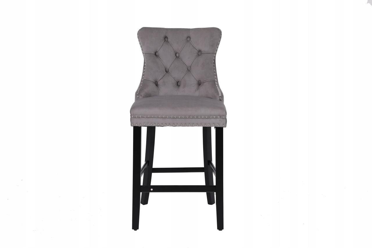 Tapicerowane siedzisko i oparcie z miękkiego weluru w odcieniu szarości zapewniają wysoki komfort, a solidny czarny stelaż na drewnianych nogach gwarantuje trwałość i stabilność całej konstrukcji.