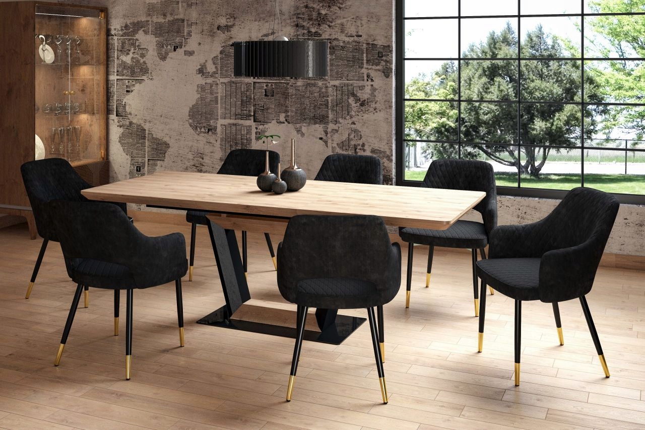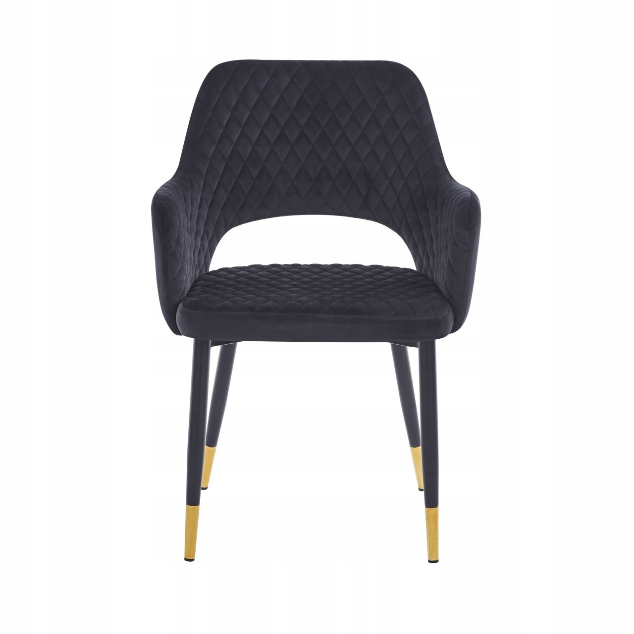 Nowoczesne krzesło o fotelowym kształcie z podłokietnikami. Tapicerowane czarną, welurową tkaniną pikowaną z przodu siedziska, tył natomiast jest gładki. Nogi zostały wykonane ze stali malowanej w kolorze czarnym ze złotym, ozdobnym zakończeniem.