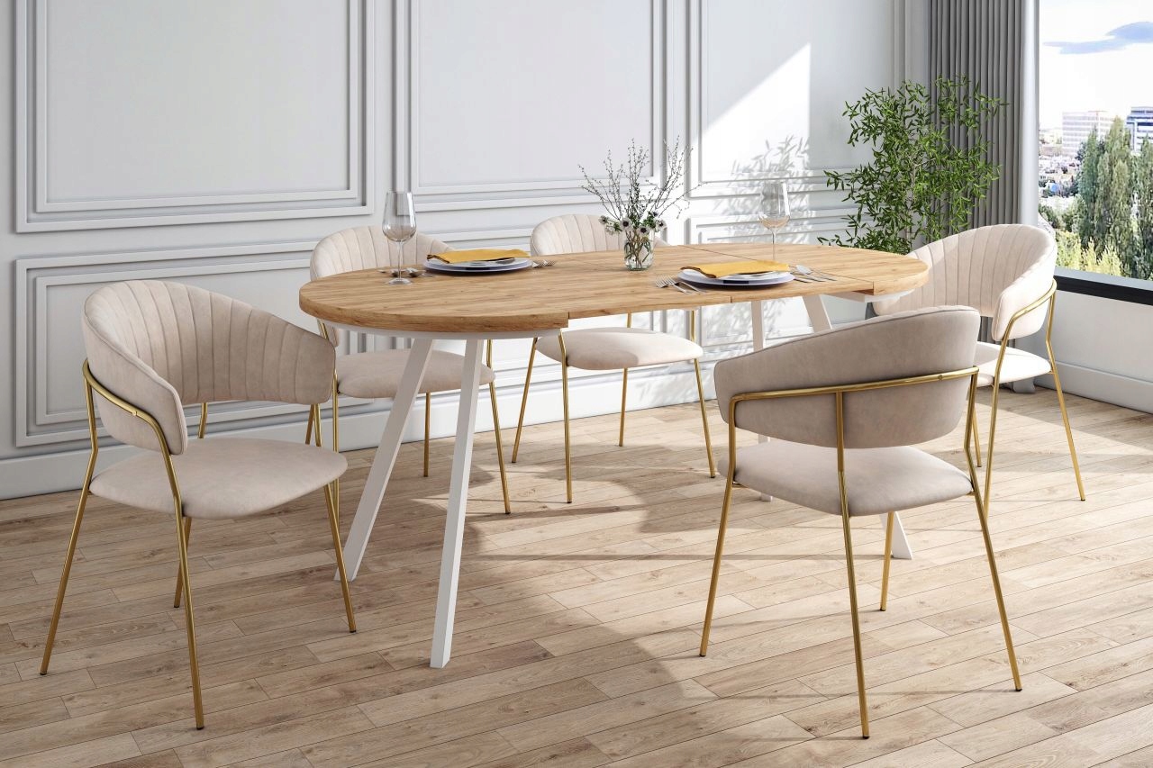 Prezentujemy Państwu designerskie krzesło marki @Furnitex, idealnie nadające się do eleganckiego salonu lub jako stylowe krzesło do stołu. Połączenie beżowego obicia z metalowymi złotymi nogami tworzy efektowną kompozycję, która zachwyci każdego.