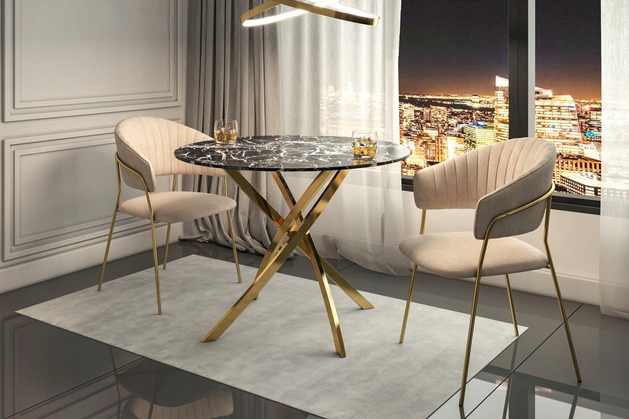 To urocze krzesło charakteryzuje się starannym wykonaniem z wysokiej jakości materiałów. Obicie wykonane jest z miękkiego i eleganckiego weluru, zapewniającego przyjemne uczucie podczas siedzenia. Stelaż z metalu w kolorze złota gwarantuje stabilność i trwałość konstrukcji.