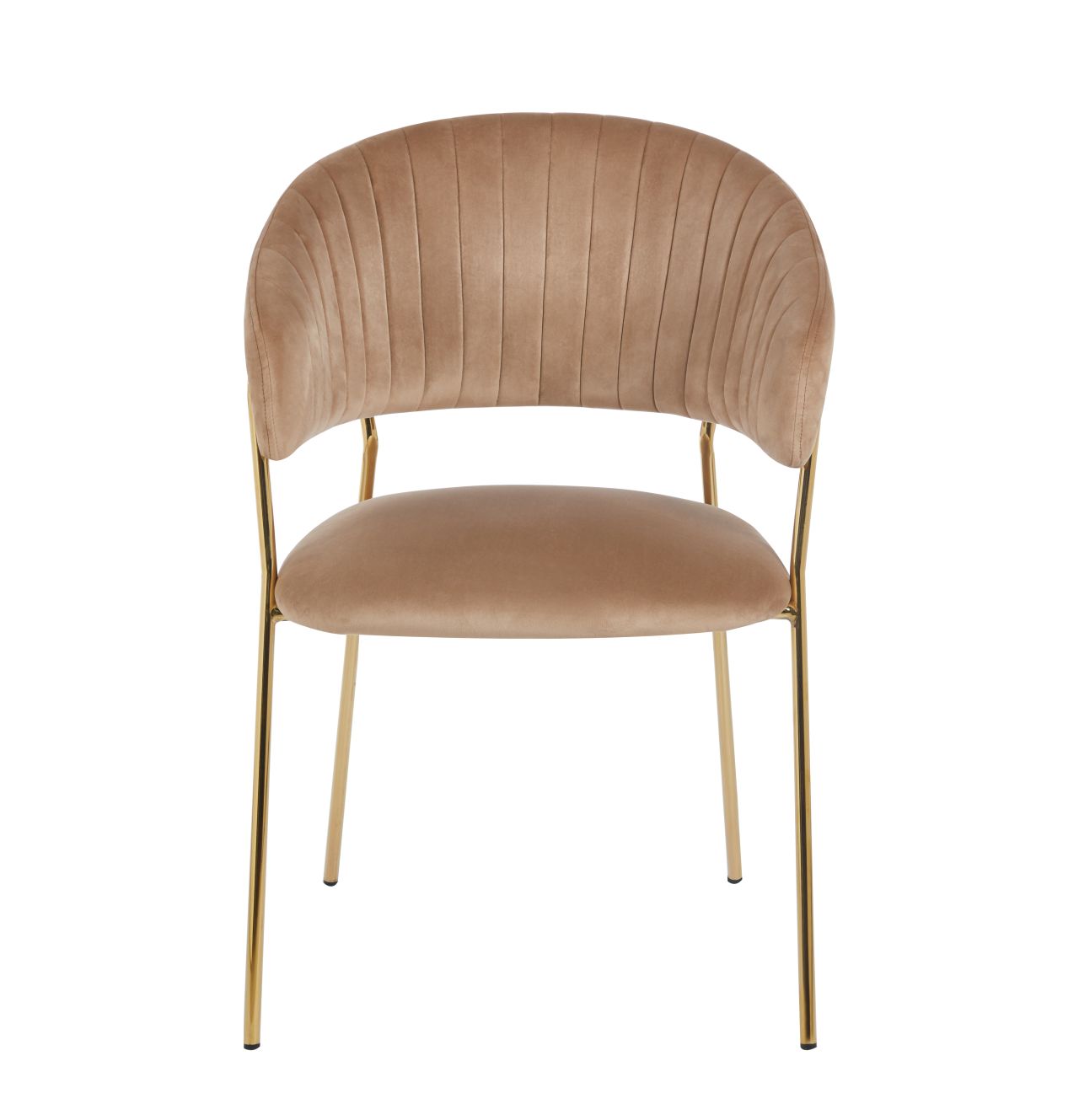 To urocze krzesło charakteryzuje się starannym wykonaniem z wysokiej jakości materiałów. Obicie wykonane jest z miękkiego i eleganckiego weluru, zapewniającego przyjemne uczucie podczas siedzenia. Stelaż z metalu w kolorze złota gwarantuje stabilność i trwałość konstrukcji.