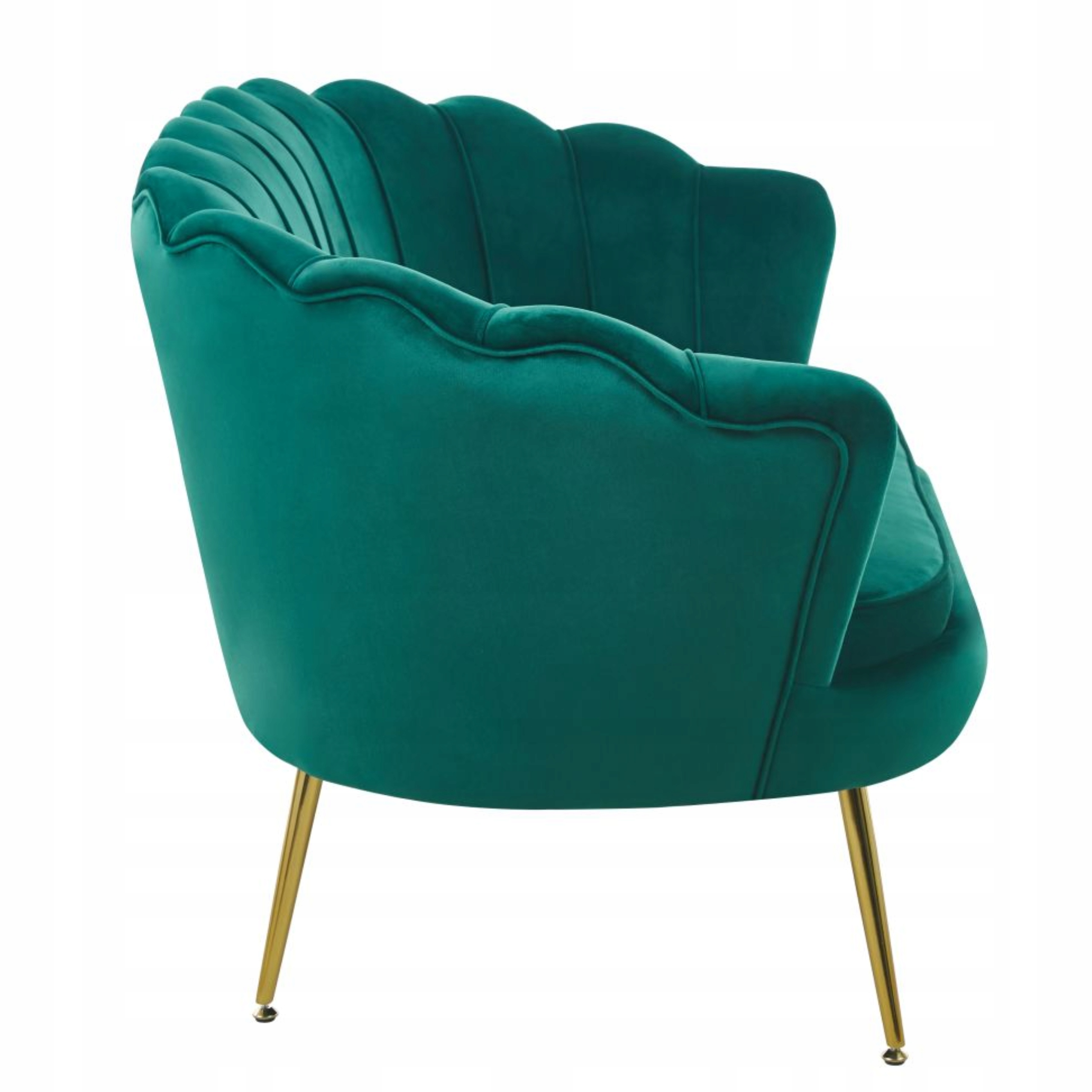 Obicie sofy wykonane jest z miękkiego weluru w odcieniu zieleni, co dodaje jej przytulności i sprawia, że jest wyjątkowo miła w dotyku. Nogi sofy są wykonane z metalu w złotym, co dodatkowo podkreśla elegancję mebla. Poduszki siedziskowe są grube i wygodne, zapewniając komfort podczas siedzenia. Sofa ta idealnie wpisuje się w romantyczne lub glamour aranżacje wnętrz.