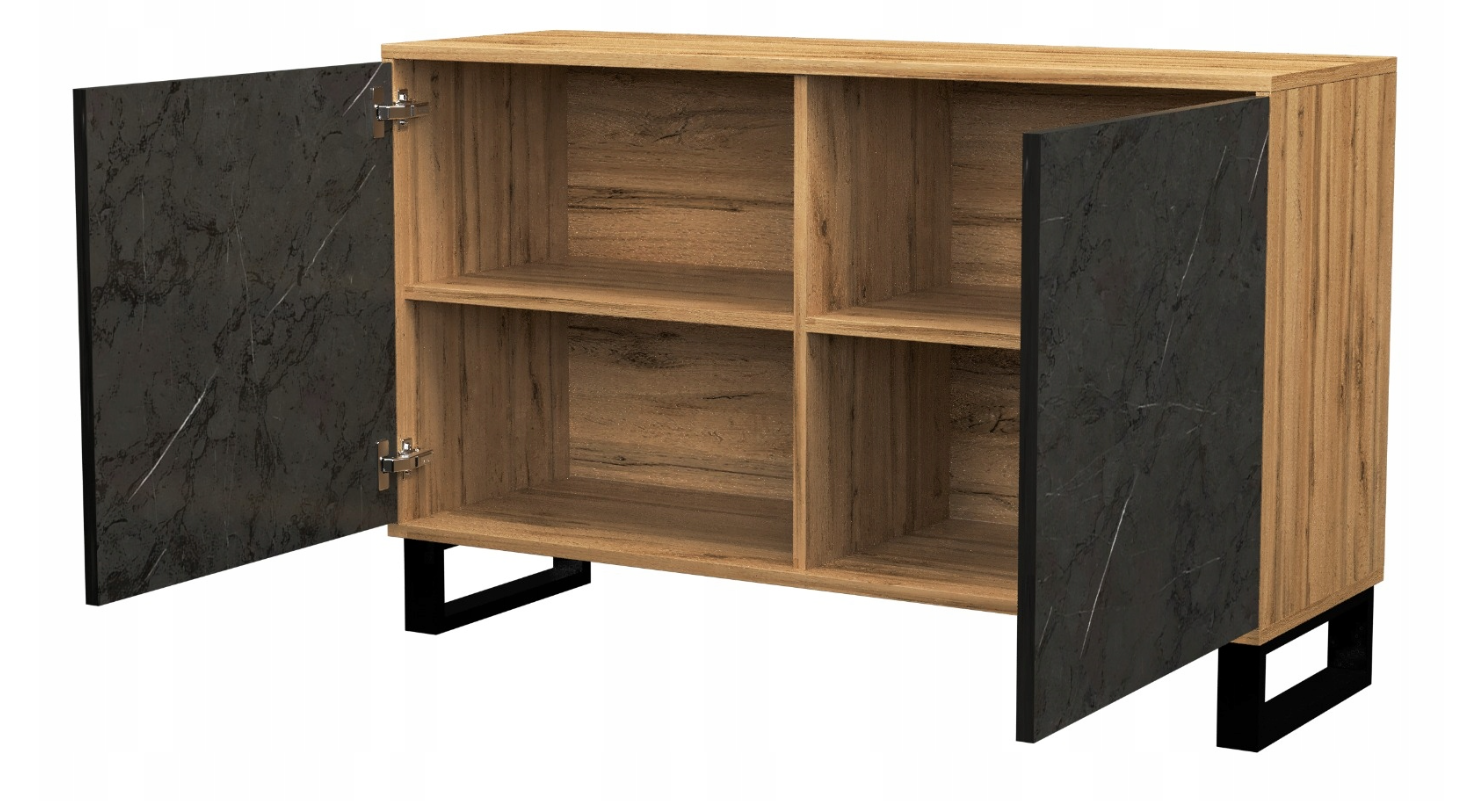 To pojemny i funkcjonalny mebel, który spełni oczekiwania nawet w codziennym użytkowaniu. Korpus wykonano z wysokiej jakości płyty laminowanej w dekorze dąb artisan, fronty z płyty laminowanej w kolorze czarny kamień, a nóżki stanowi stabilna czarna metalowa podpora. Całości dopełnia bezuchwytowy system otwierania, podkreślający nowoczesny charakter mebla.