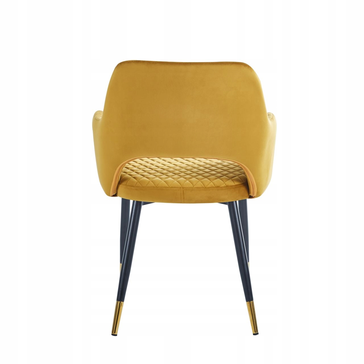 Nowoczesne krzesło o fotelowym kształcie z podłokietnikami. Tapicerowane curry, welurową tkaniną pikowaną z przodu siedziska, tył natomiast jest gładki. Nogi zostały wykonane ze stali malowanej w kolorze czarnym ze złotym, ozdobnym zakończeniem.