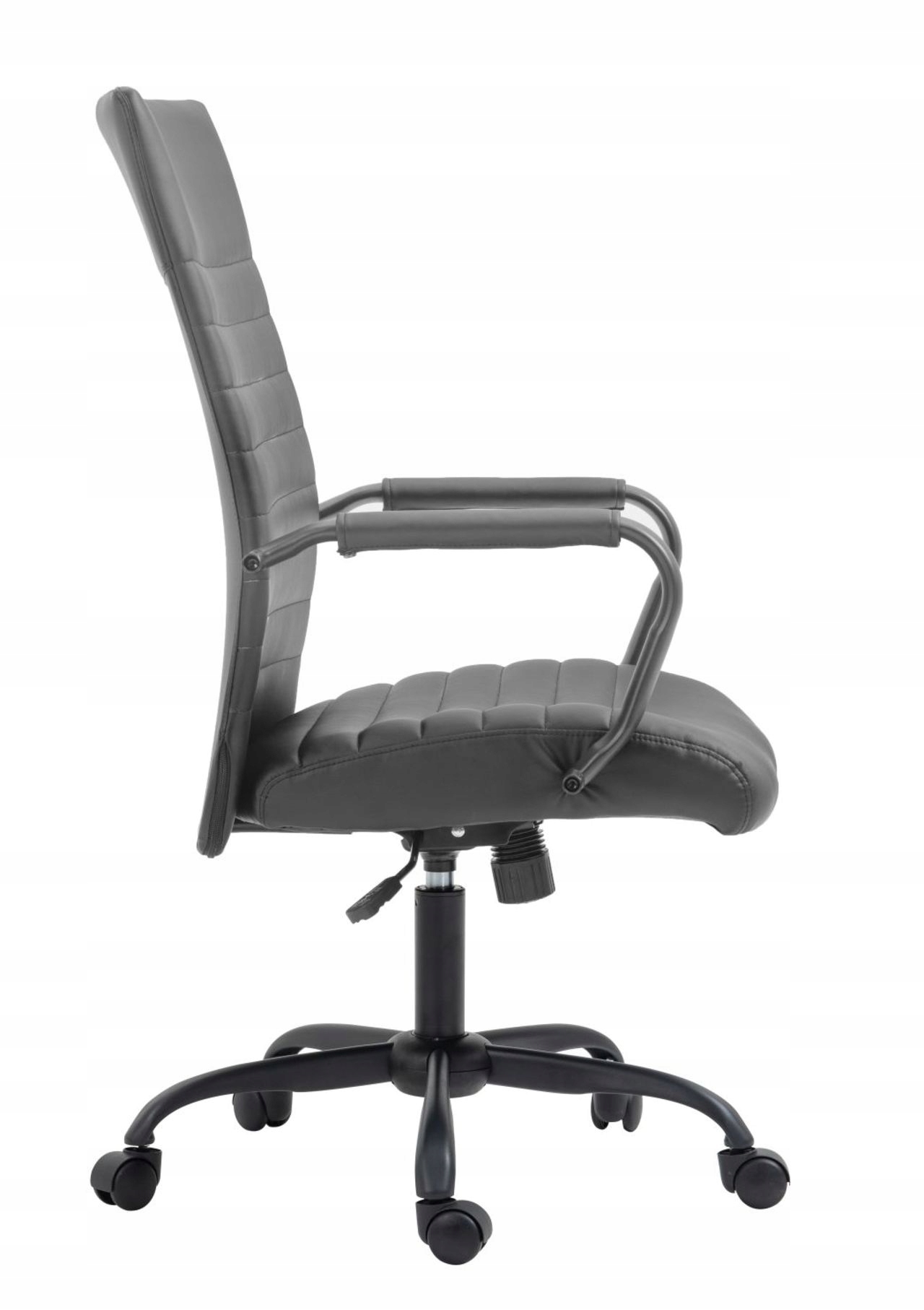 Fotel biurowy idealnie dopasowujący się do sylwetki siedzącego, obity miękką eko skórą. Wyprofilowany tak, aby zapewnić maksymalną wygodę, nawet przy wielogodzinnym siedzeniu. Wysoki, wbudowany zagłówek i odpowiednie wyprofilowanie gwarantuje funkcjonalność i oparcie dla głowy, a szerokie siedzisko pozwoli na wielogodzinną pracę. Podłokietniki są odpowiednio ukształtowane, co podnosi wygodę użytkowania, a także obciążenie kręgosłupa. 5 - ramienna podstawa - krzyżak z podwójnymi kółkami łatwo się obraca i zapewnia stabilne przemieszczanie.