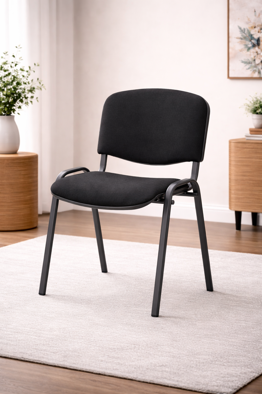 Projekt tego modelu oparty jest na solidnym, metalowym stelażu malowanym proszkowo, który zapewnia stabilność oraz wytrzymałość nawet podczas intensywnej eksploatacji. Siedzisko i oparcie zostały pokryte tapicerką z czarnej tkaniny materiałowej (kolor Oban EF019), odpornej na ścieranie i łatwej w utrzymaniu czystości.