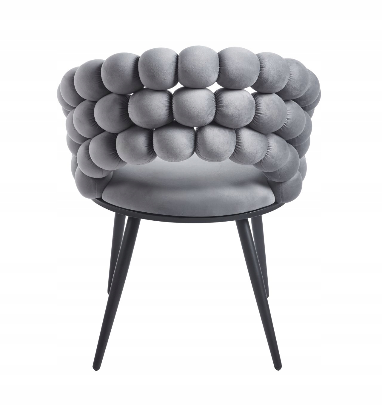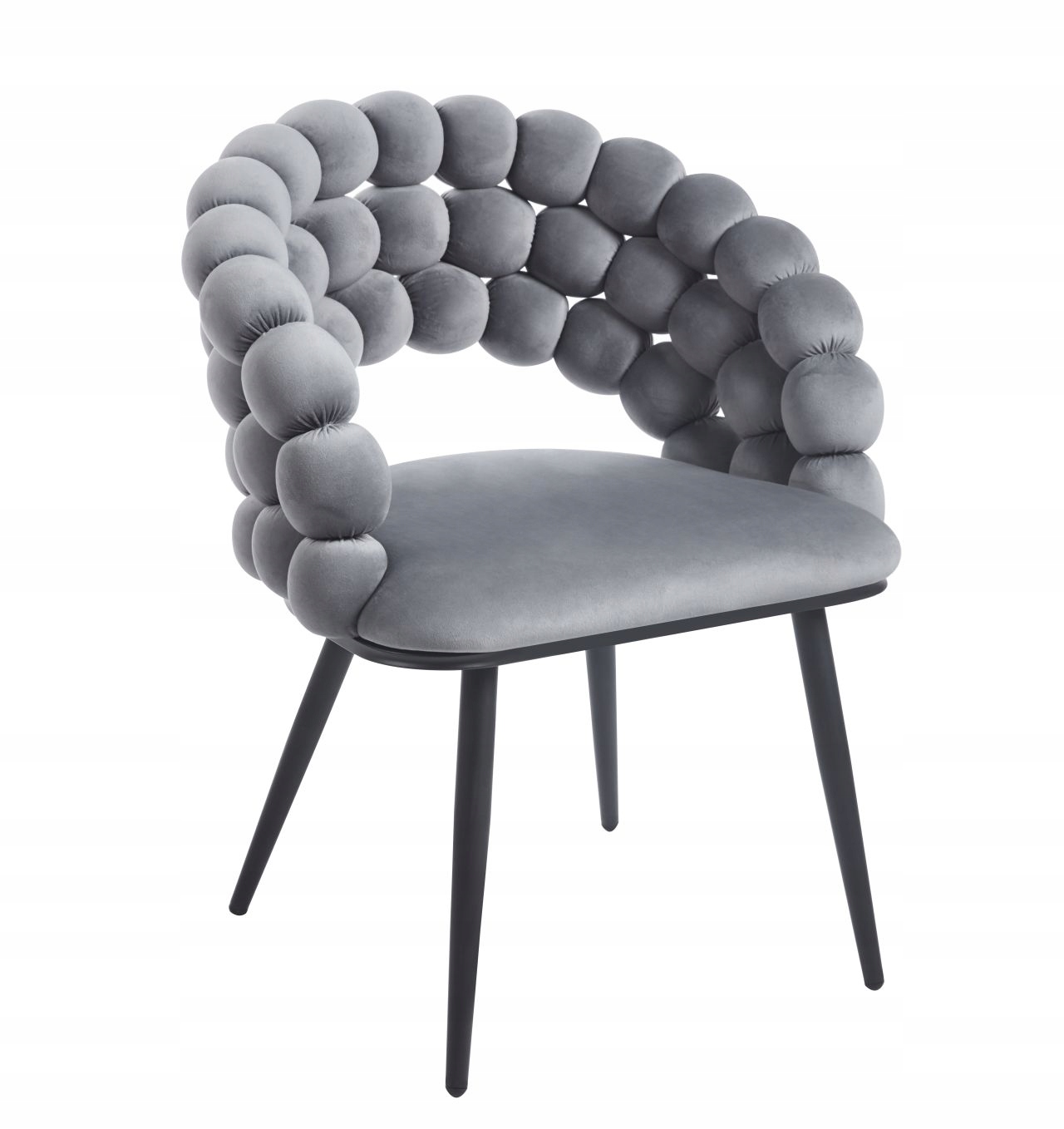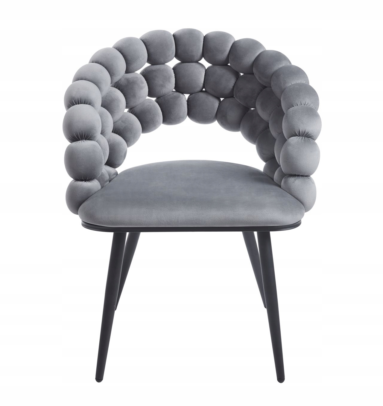 Eleganckie krzesło w odcieniu szarości, wykończone welurową tkaniną, doskonale uzupełni aranżacje salonowe, gabinetowe i sypialniane. Model Bubble od Furnitex łączy modny glamour z komfortem użytkowania — oparcie z charakterystycznymi kulkami tworzy efektowny, a jednocześnie praktyczny design, zapewniając miękkie wsparcie dla pleców.