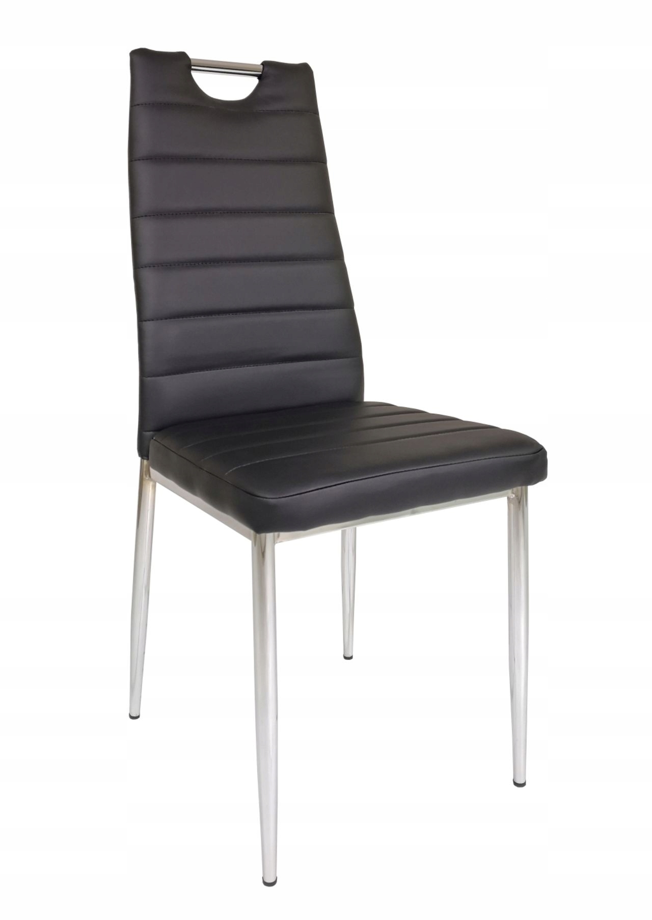 Nowoczesne krzesło do jadalni od Furnitex w klasycznej czerni, wykonane z wysokiej jakości ekoskóry oraz z chromowanym uchwytem do przenoszenia. To połączenie stylu i funkcjonalności, które doskonale sprawdzi się w domowych wnętrzach, jak i w kawiarnianych czy biurowych aranżacjach.