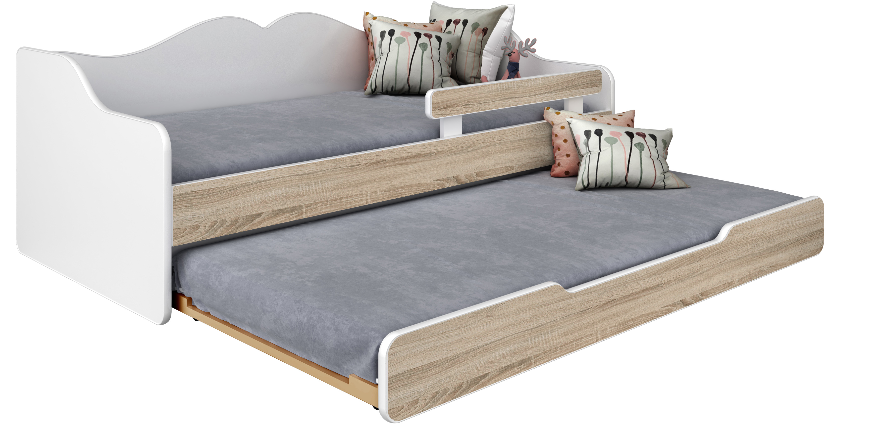 W zestawie znajduje się praktyczna szuflada z materacem, która pełni rolę drugiego łóżka. To doskonałe rozwiązanie dla rodzeństwa lub gości na noc, a także świetnie sprawdza się w mniejszych wnętrzach, gdzie nie ma potrzeby dwóch oddzielnych łóżek.