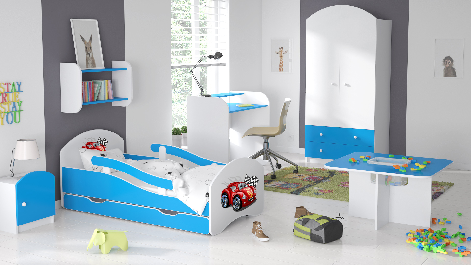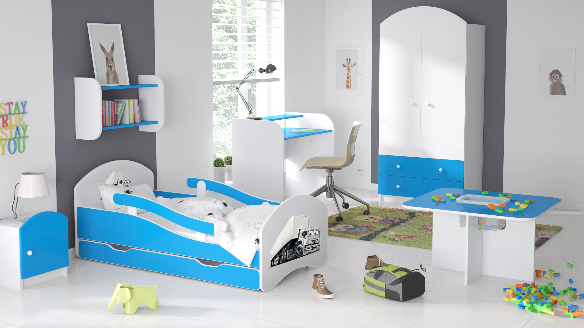 Łóżko dziecięce LEO 160x70 w klasycznej, biało-niebieskiej odsłonie łączy nowoczesny design z bezpieczeństwem i praktycznością. Wykonane z wysokiej jakości płyty meblowej zapewnia stabilną i trwałą konstrukcję, która rośnie razem z maluchem.