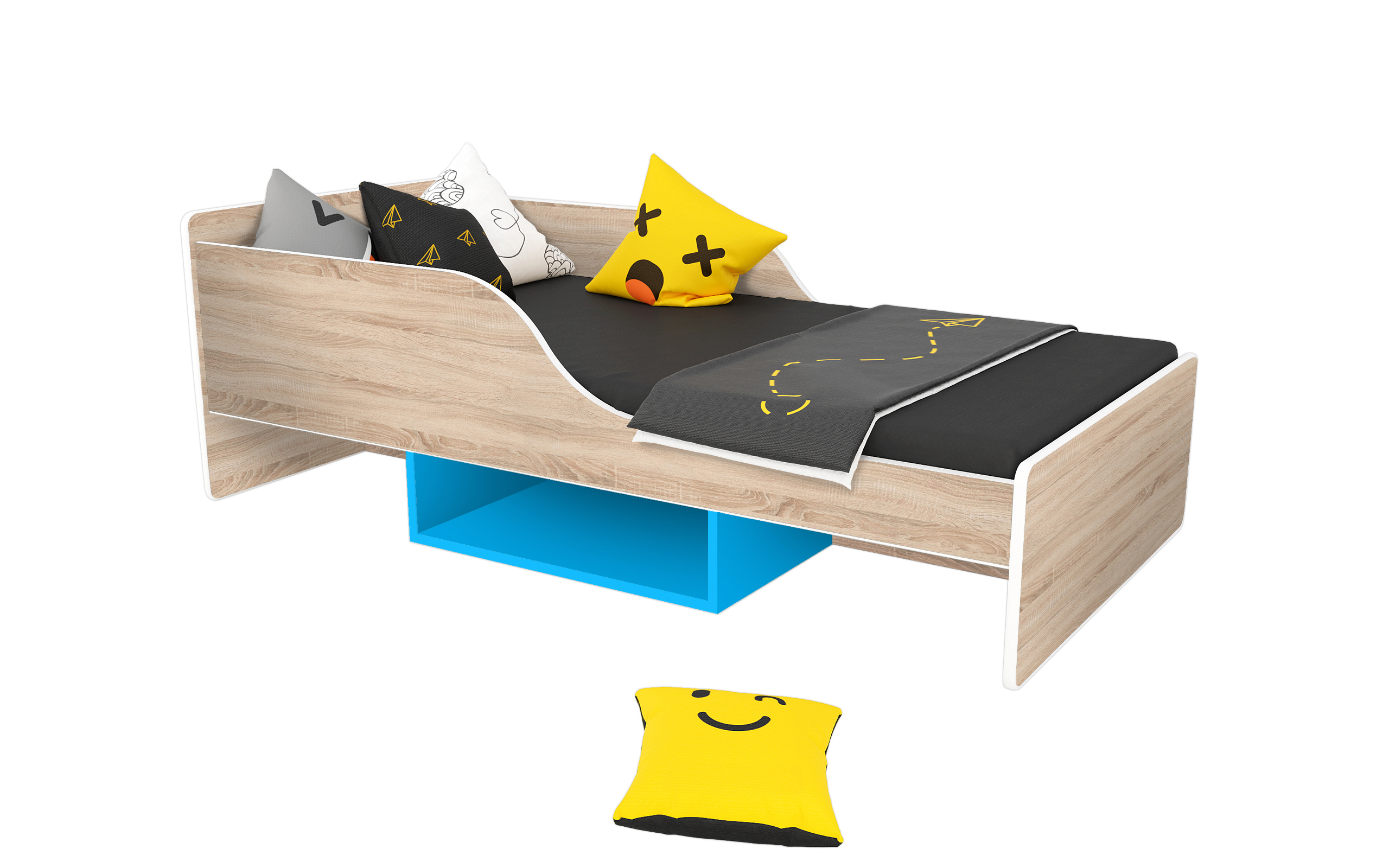Unikalnym elementem mebla jest praktyczna półka pod łóżkiem (w kolorze niebieskim), która tworzy dodatkową przestrzeń na książki, czasopisma i inne drobiazgi.