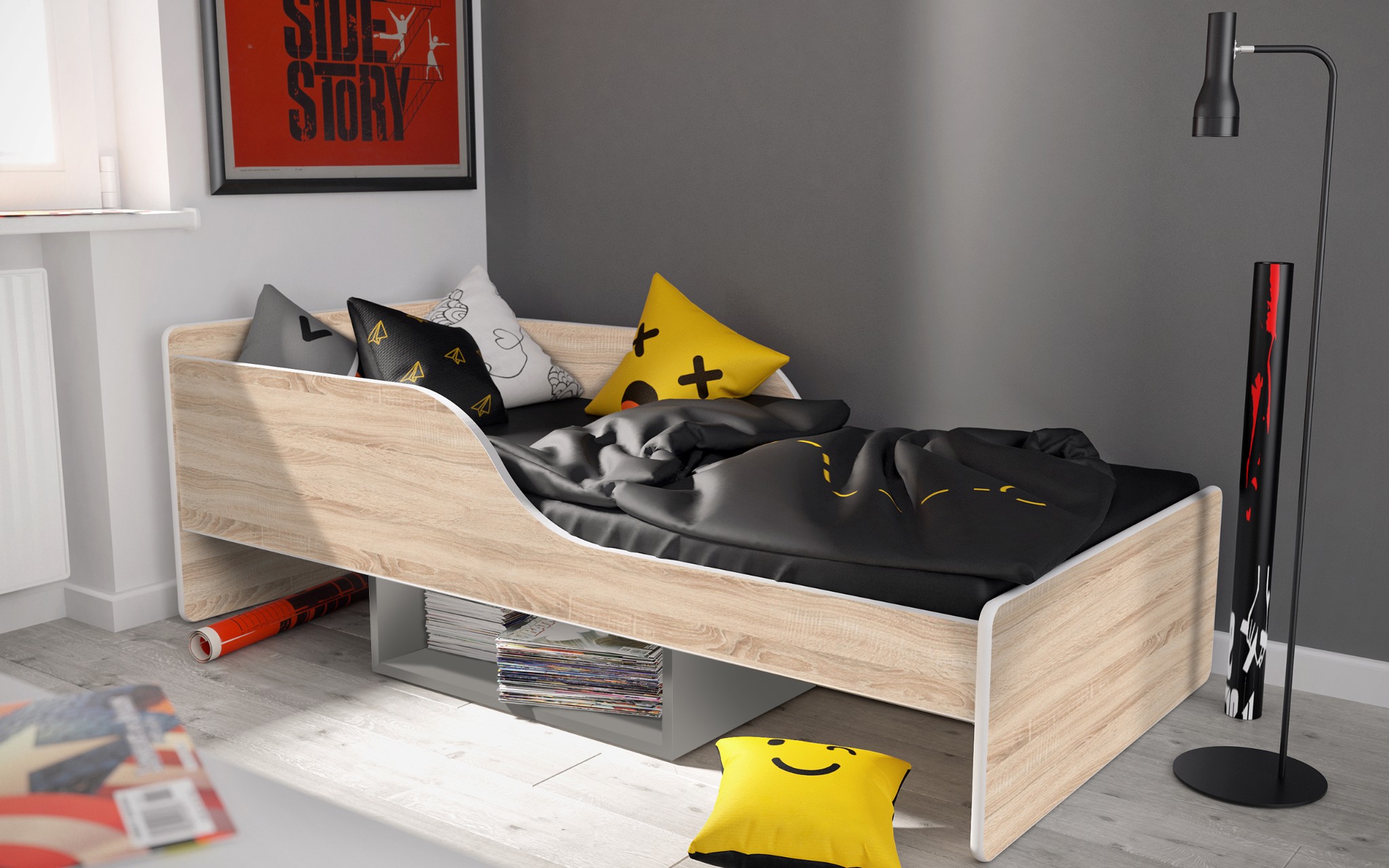 Wykonane z wysokiej jakości płyty meblowej, zapewnia trwałą i stabilną konstrukcję, która wytrzymuje intensywne użytkowanie. Dodatkowa listwa wzdłuż spodu pod stelażem wzmacnia całość i umożliwia obciążenie aż do 130 kg. Boki oraz fronty łóżka wykończono miękkim gumowym obrzeżem, zapewniającym gładkie krawędzie i bezpieczeństwo użytkowania.