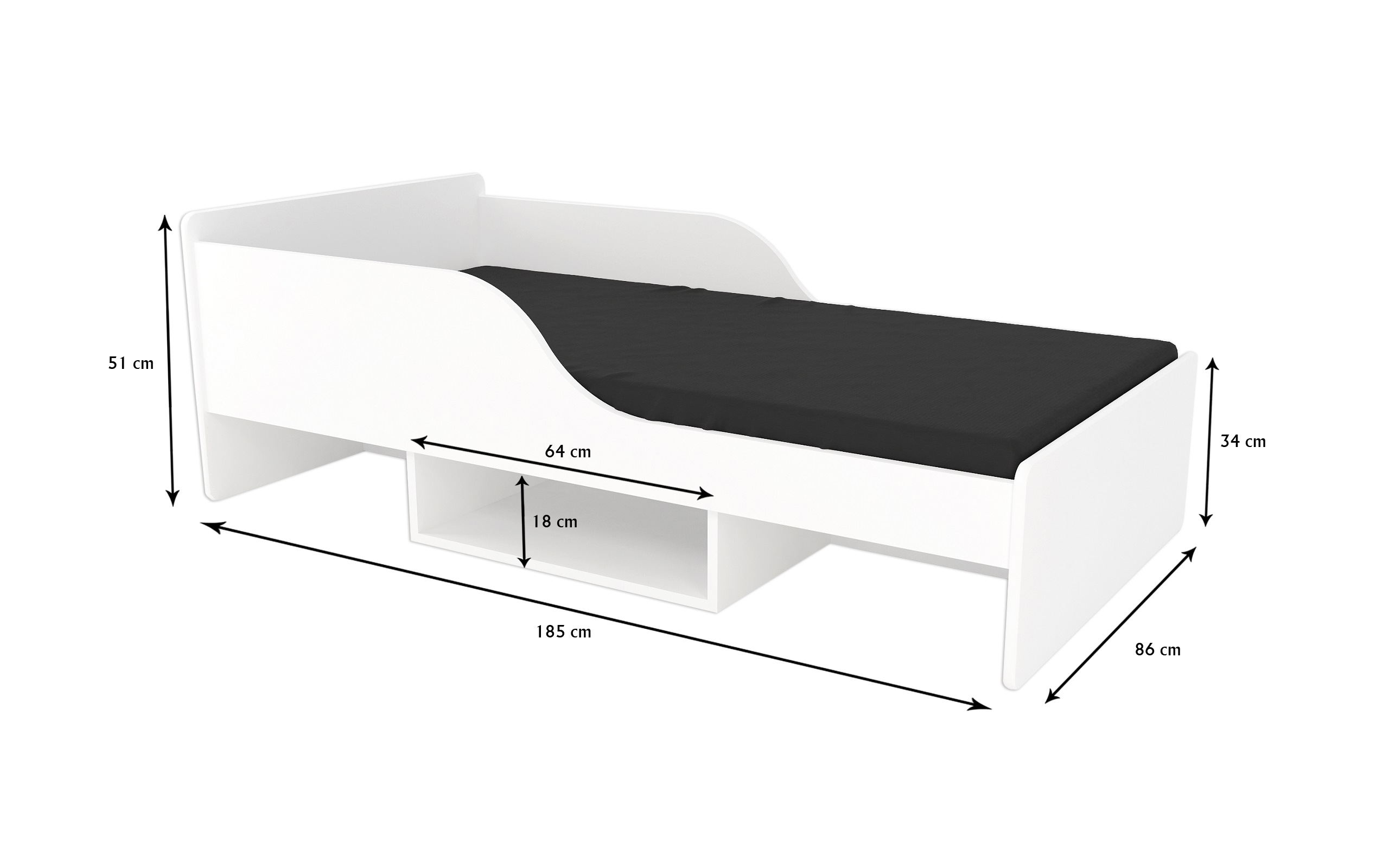 Wyróżnikiem mebla jest praktyczna półka pod łóżkiem, która tworzy dodatkową przestrzeń na książki, gazety czy inne niezbędne drobiazgi.