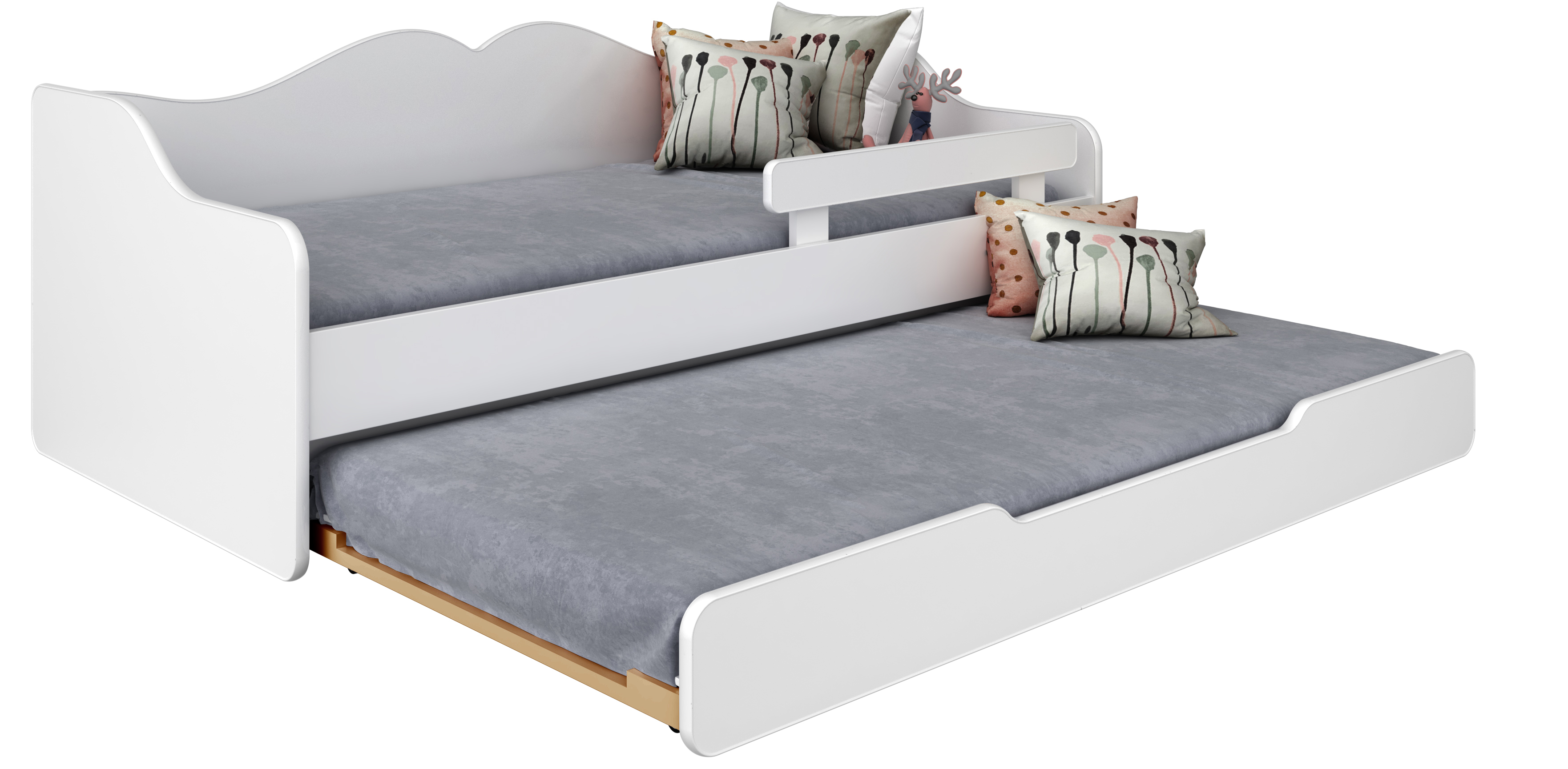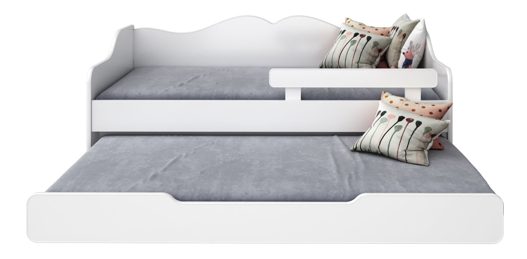 W zestawie znajduje się szuflada z dodatkowym materacem, która tworzy drugie łóżko. To praktyczne rozwiązanie dla rodzeństwa lub gości na noc. Sprawdzi się także w mniejszych pomieszczeniach, gdzie nie ma miejsca na dwa osobne łóżka.