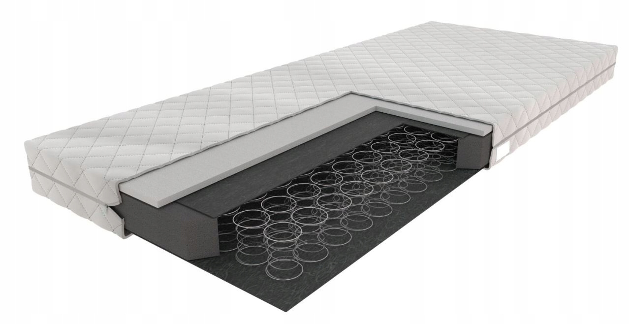 Materac na sprężynach bonellowych, połączonych ze sobą w szeregach dzięki czemu mogą wspólnie wypierać masę ciała, z drutu podwójnie hartowanego Elastyczna pianka poliuretanowa z pięciu stron materaca