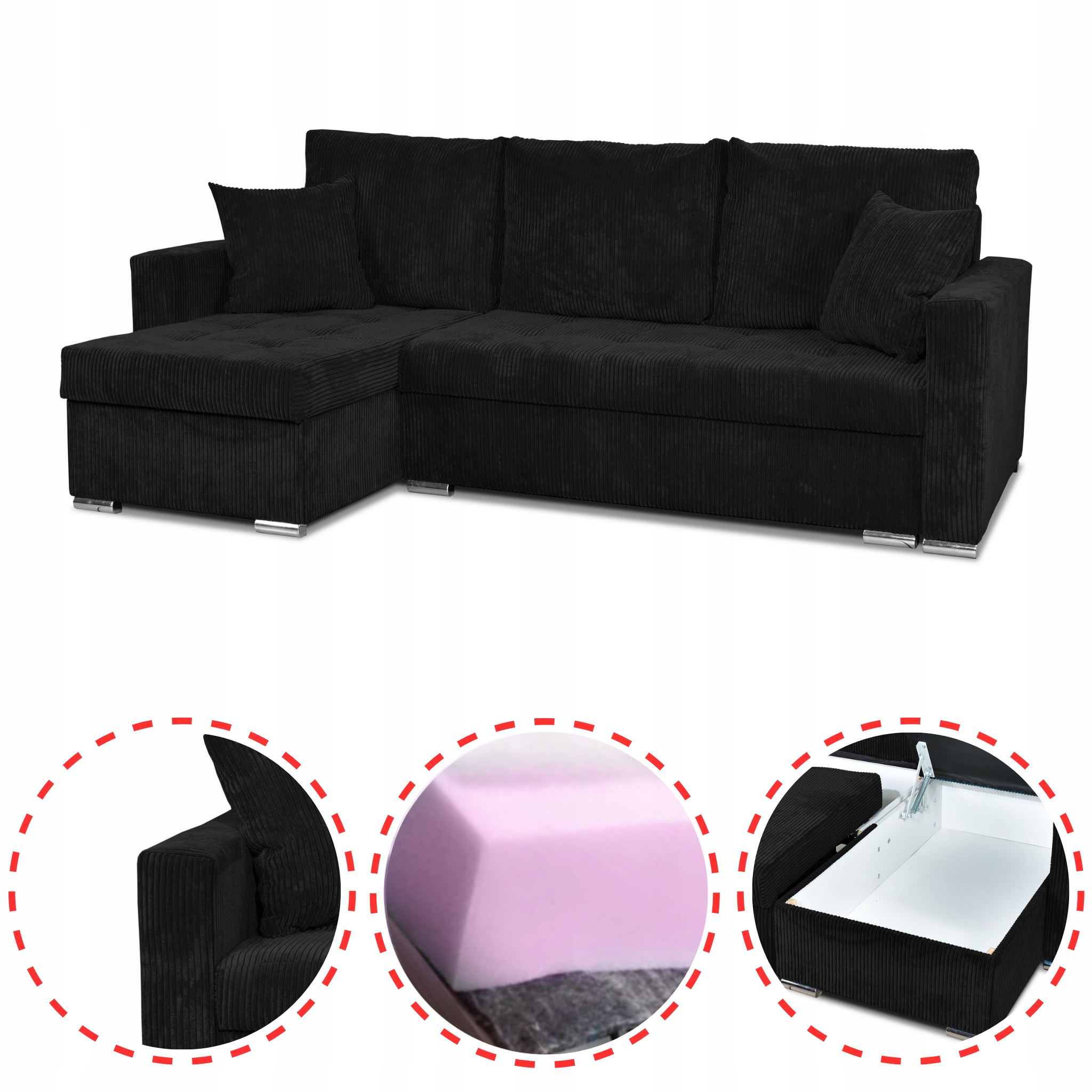 - Standardowo w zestawie 5 poduszek, które mieszczą się w naszych pojemnych, wysokich schowkach.