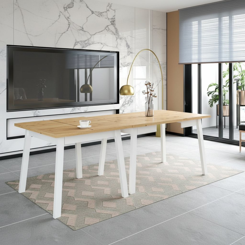 Ten stół to idealne połączenie elegancji i funkcjonalności. W standardowej wersji ma kształt prostokąta 90 cm – doskonały do codziennego użytku w mniejszych przestrzeniach. Gdy jednak potrzebujesz więcej miejsca, np. na spotkanie rodzinne czy przyjęcie, z łatwością rozłożysz go do długości 125 cm!