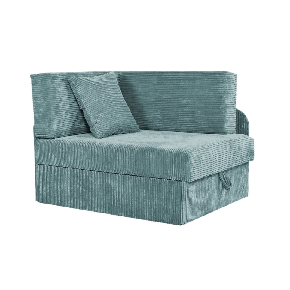 Wykonany z wytrzymałego sztruksu, miłego w dotyku i łatwego w utrzymaniu czystości, idealnego do dziecięcego pokoju. Solidny stelaż z litego drewna i wzmocnionej płyty meblowej gwarantuje stabilność i bezawaryjność przez długi czas. Dodatkowo narożnik wyposażony jest w pojemnik na pościel, który umożliwia szybkie przechowywanie pościeli i zabawek, pomagając utrzymać porządek w dziecięcym królestwie.
