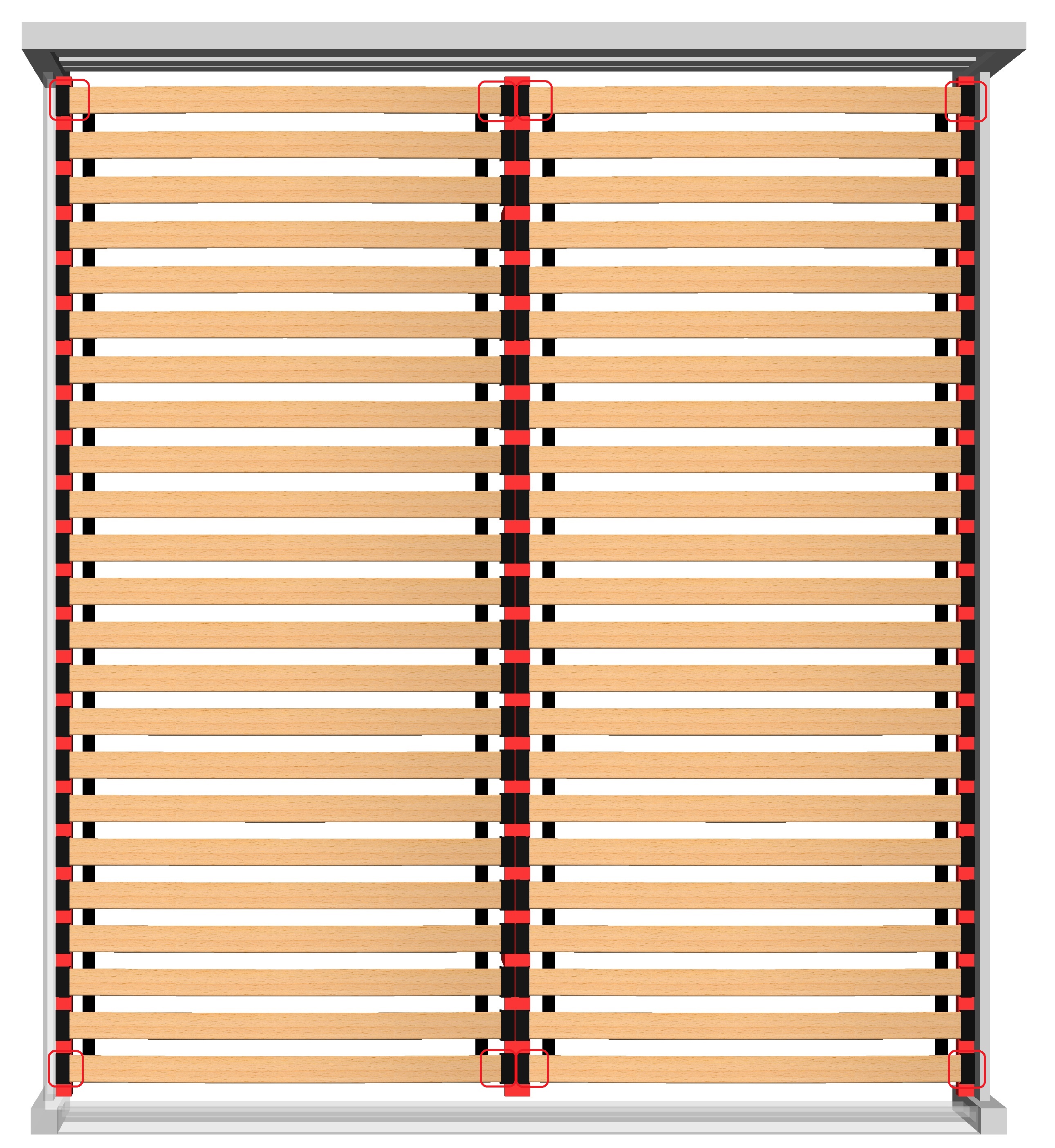 - Składa się z dwóch rzędów listew spiętych syntetycznymi pasami o dużej wytrzymałości, gwarantujących równomierne rozłożenie obciążenia na ramie łóżka.