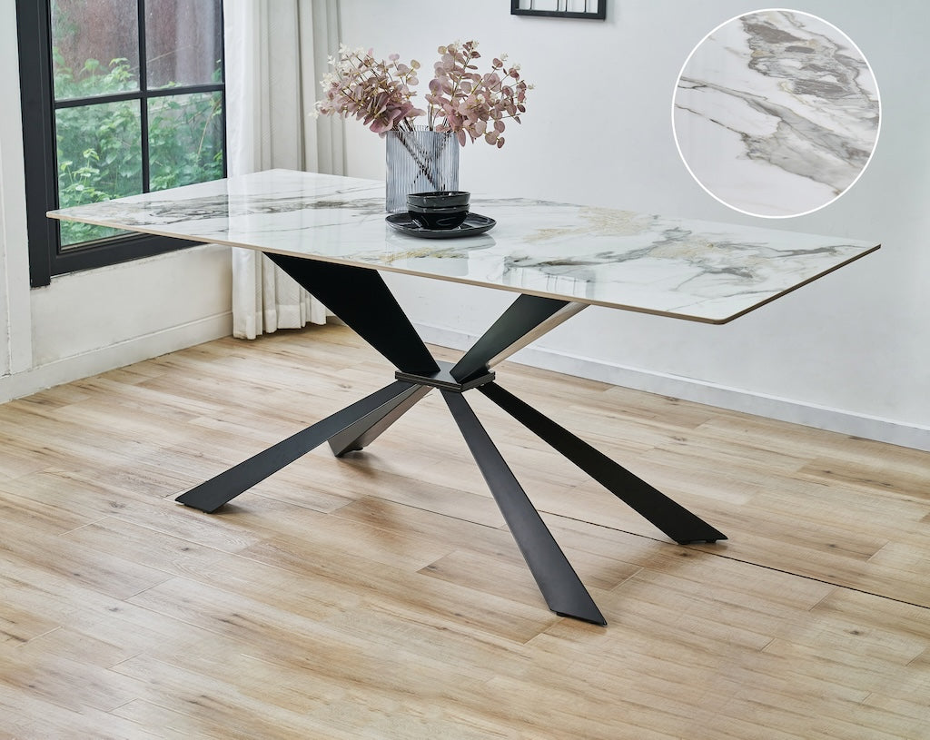 Szukasz stołu, który łączy luksusowy wygląd marmuru, nowoczesną formę i wyjątkową trwałość? Stół Fornis to propozycja dla osób, które cenią prestiżowy design oraz ponadczasową estetykę. Blat ze spieku kamiennego w efektownym wykończeniu marmurowym nadaje wnętrzu ekskluzywnego charakteru, a czarna, metalowa podstawa podkreśla jego nowoczesną linię.