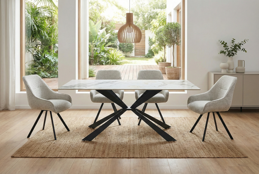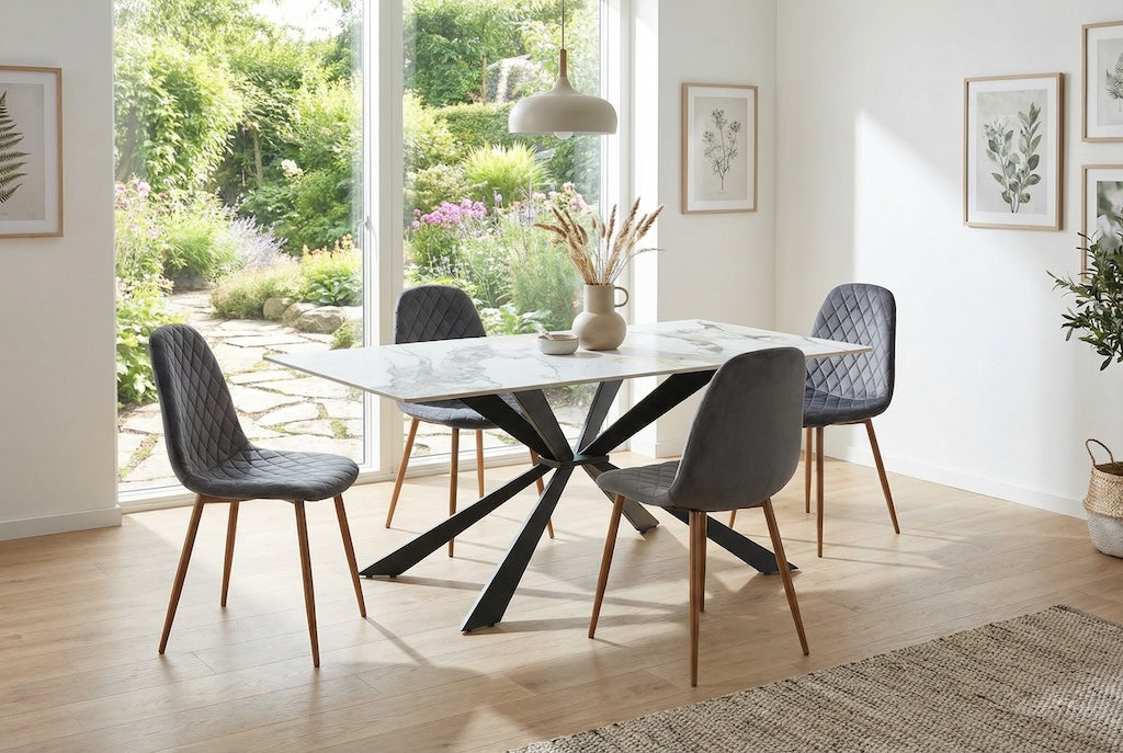 Dzięki eleganckiemu, marmurowemu wykończeniu w stylu Calacatta stół Fornis doskonale komponuje się z krzesłami tapicerowanymi, welurowymi modelami glamour, minimalistycznymi czarnymi formami oraz naturalnym drewnem. Świetnie odnajduje się w aranżacjach nowoczesnych, loftowych, glamour oraz minimalistycznych.