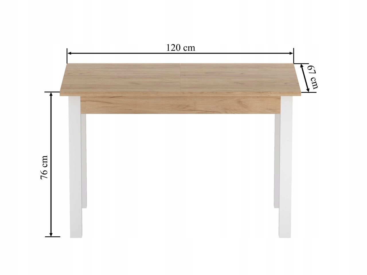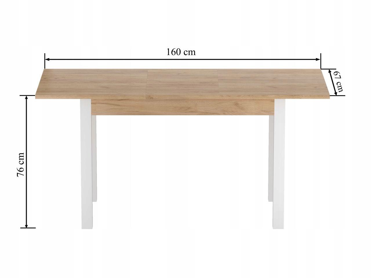 Standardowo oferuje miejsca dla 6 osób, a dzięki funkcji rozkładania zyskuje dodatkowy, wyjątkowo wygodny nacisk podczas rodzinnych spotkań. Wymiary w wersji podstawowej to 120x67 cm, a po rozłożeniu – 160x67 cm; wysokość stołu wynosi 76 cm, zapewniając wygodny kąt siedzenia.