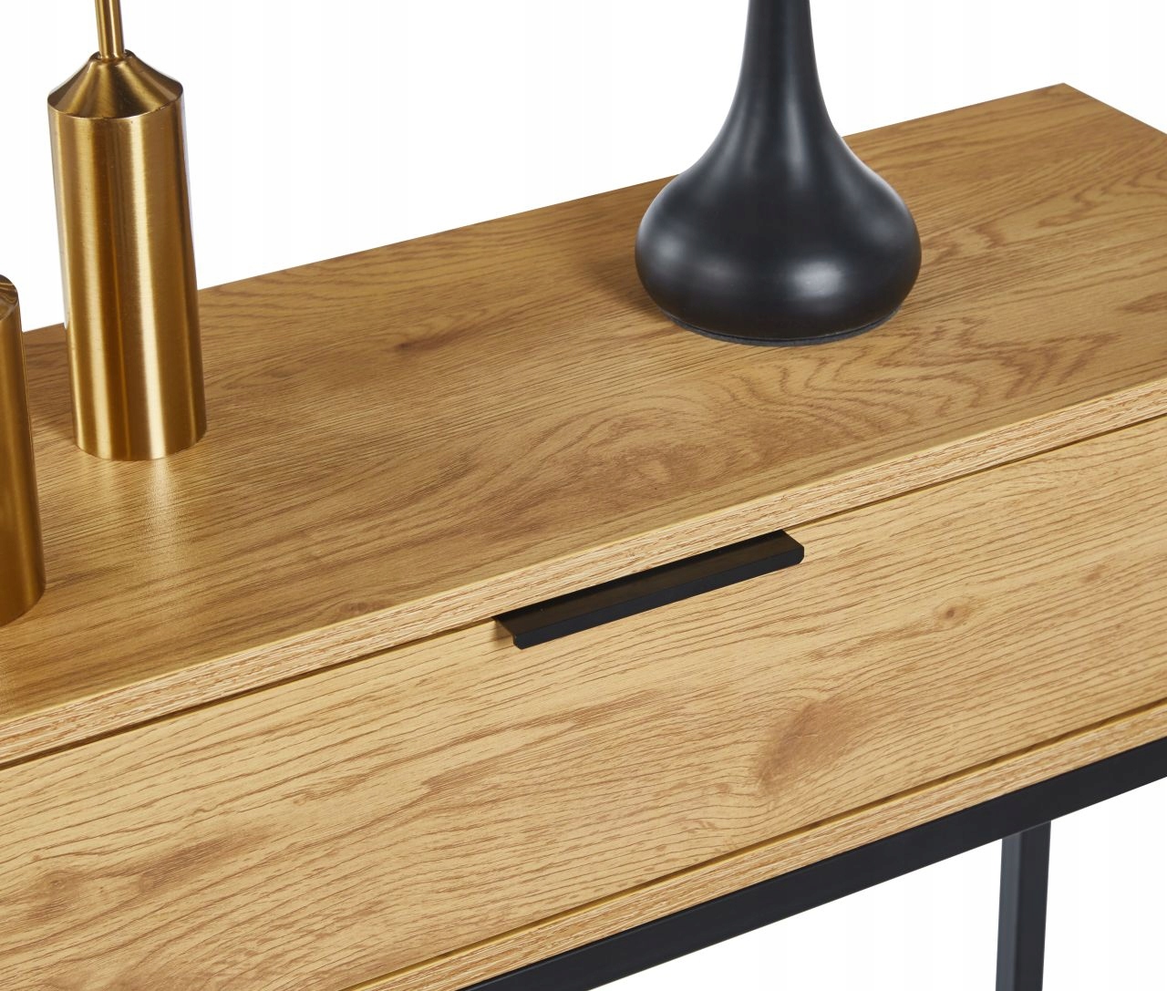 Wyjątkowa, praktyczna, elegancka, a zarazem prosta konsola . Połączenie metalu z blatem w kolorze dąb naturalny Solidny blat w kształcie prostokąta o grubości 1,8 cm, wygląda bardzo estetycznie. Nogi proste z wzmocnieniem na dole . Malowane proszkowo na czarny kolor. Idealnie sprawdzi się w Twoim przedpokoju lub nawet w salonie.