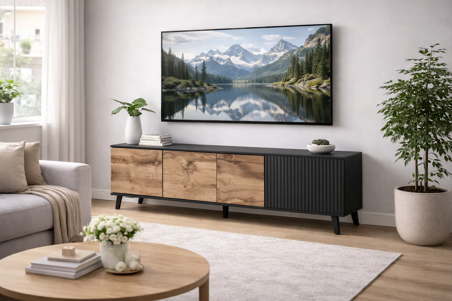 Szeroki blat o długości 200 cm zapewnia stabilne i bezpieczne miejsce na duży telewizor, sprzęt audio lub dekoracje. Wnętrze szafki zostało zaprojektowane tak, aby umożliwić wygodne przechowywanie urządzeń multimedialnych, konsol, pilotów oraz akcesoriów, dzięki czemu strefa telewizyjna pozostaje uporządkowana i estetyczna. Otwarta forma i zamknięte przestrzenie pozwalają zachować balans pomiędzy ekspozycją a przechowywaniem.