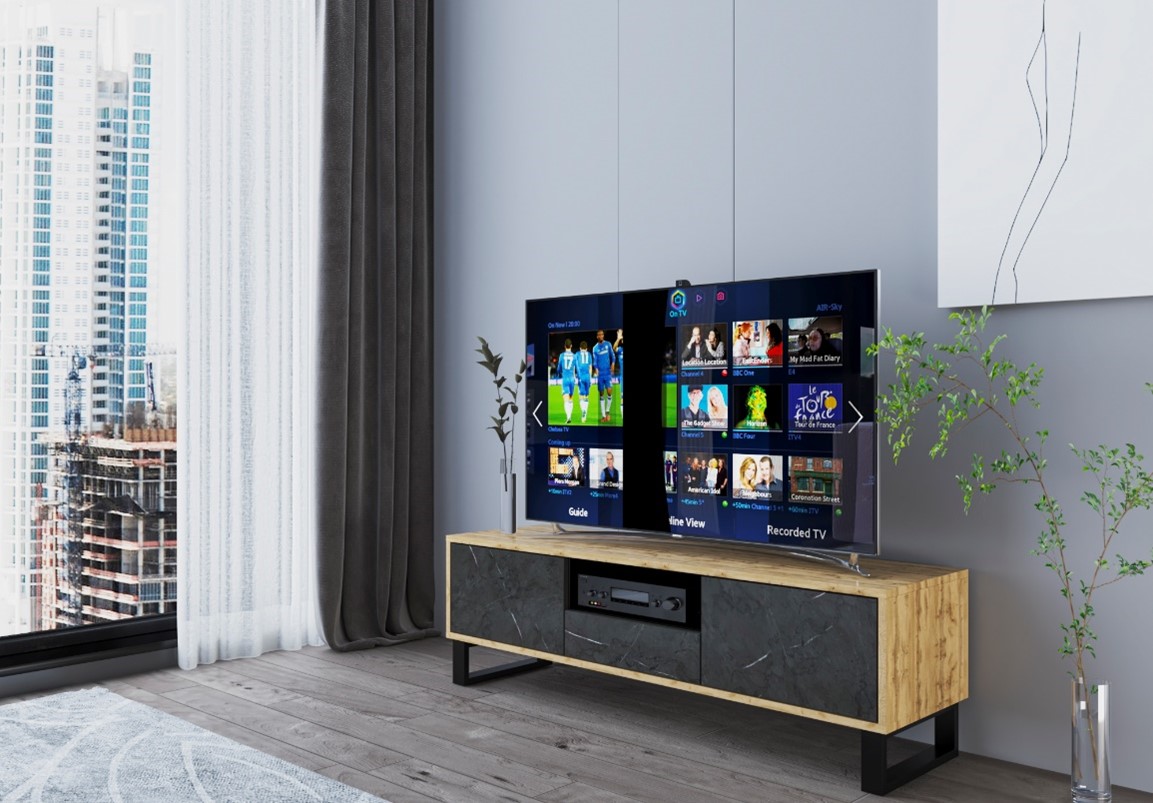 Przemyślany układ zapewnia funkcjonalne przechowywanie sprzętu RTV i domowych akcesoriów, łącząc porządek z nowoczesnym designem.