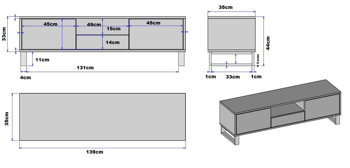 - Szerokość: 139 cm, Wysokość: 43 cm, Głębokość: 35 cm