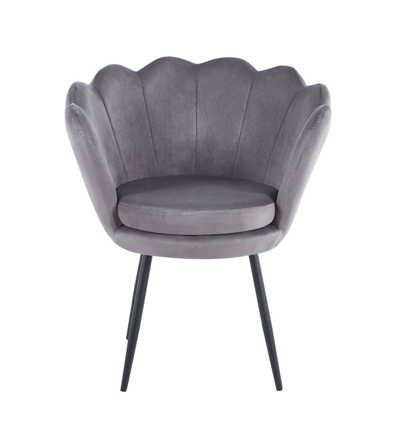 Wymiary i parametry: Całkowita wysokość 77,5 cm; wysokość siedziska 39,5 cm; wysokość oparcia 37 cm; głębokość siedziska 42 cm; szerokość siedziska 38 cm; szerokość całkowita 68 cm. Materiał: Velvet; nogi: czarny chrom. Kolor: siedzisko szare; nogi czarne. Maksymalne obciążenie: 150 kg.