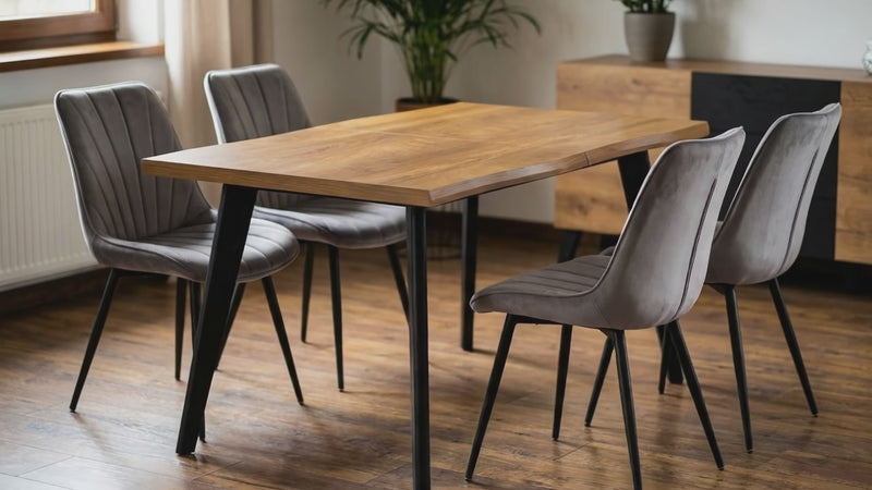Marzysz o jadalni, która łączy w sobie surowość industrialnego stylu z przytulną elegancją? Zestaw składający się ze stołu Vega oraz 4 krzeseł Ara to gotowa recepta na wnętrze pełne klasy. Połączenie ciepłego odcienia dębu, głębokiej czerni metalu i popielatego weluru tworzy kompozycję idealną – nowoczesną, a zarazem niezwykle gościnną.
